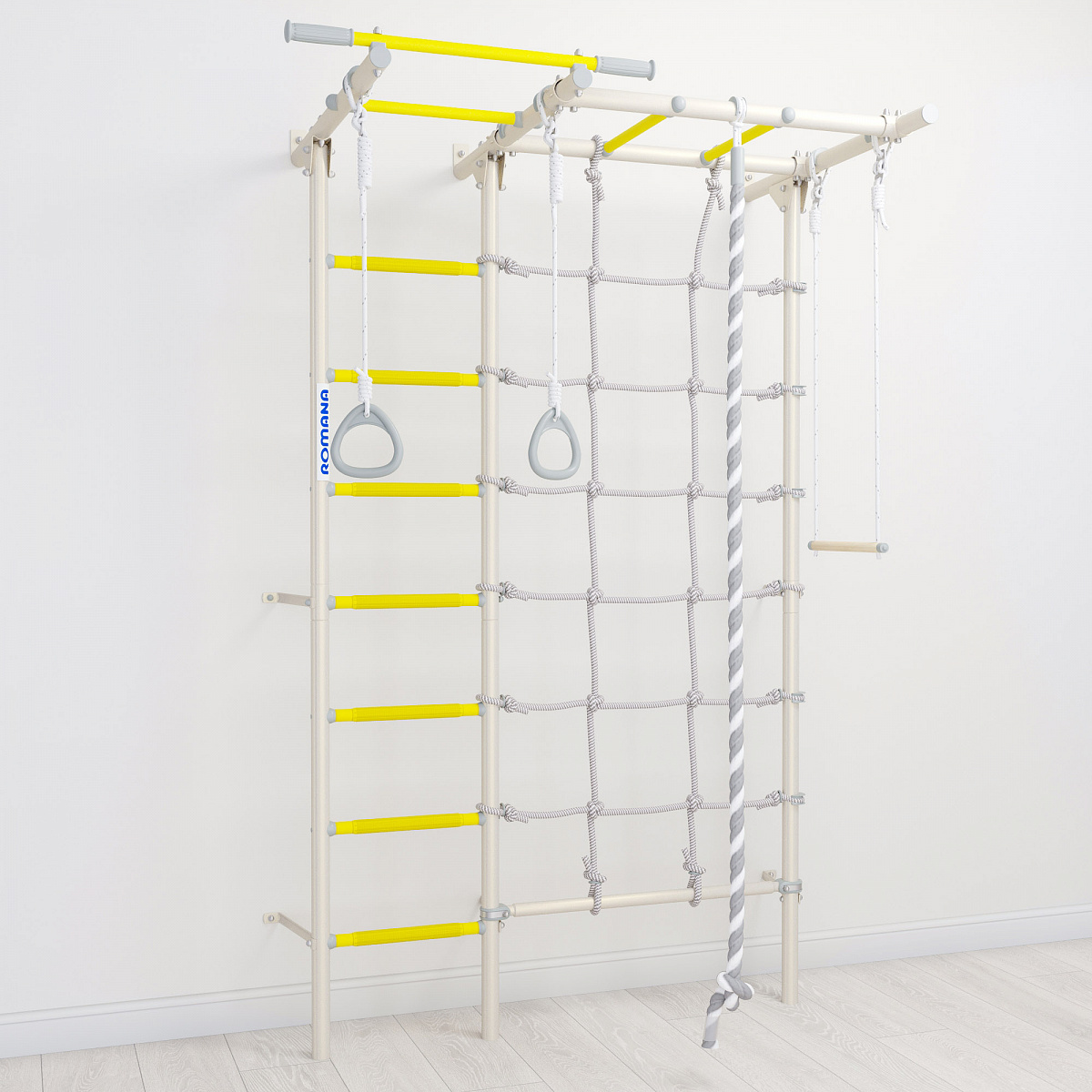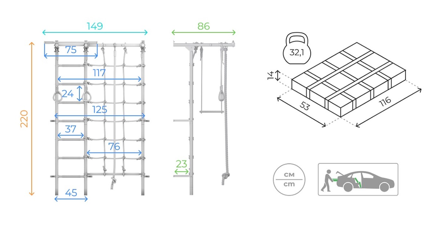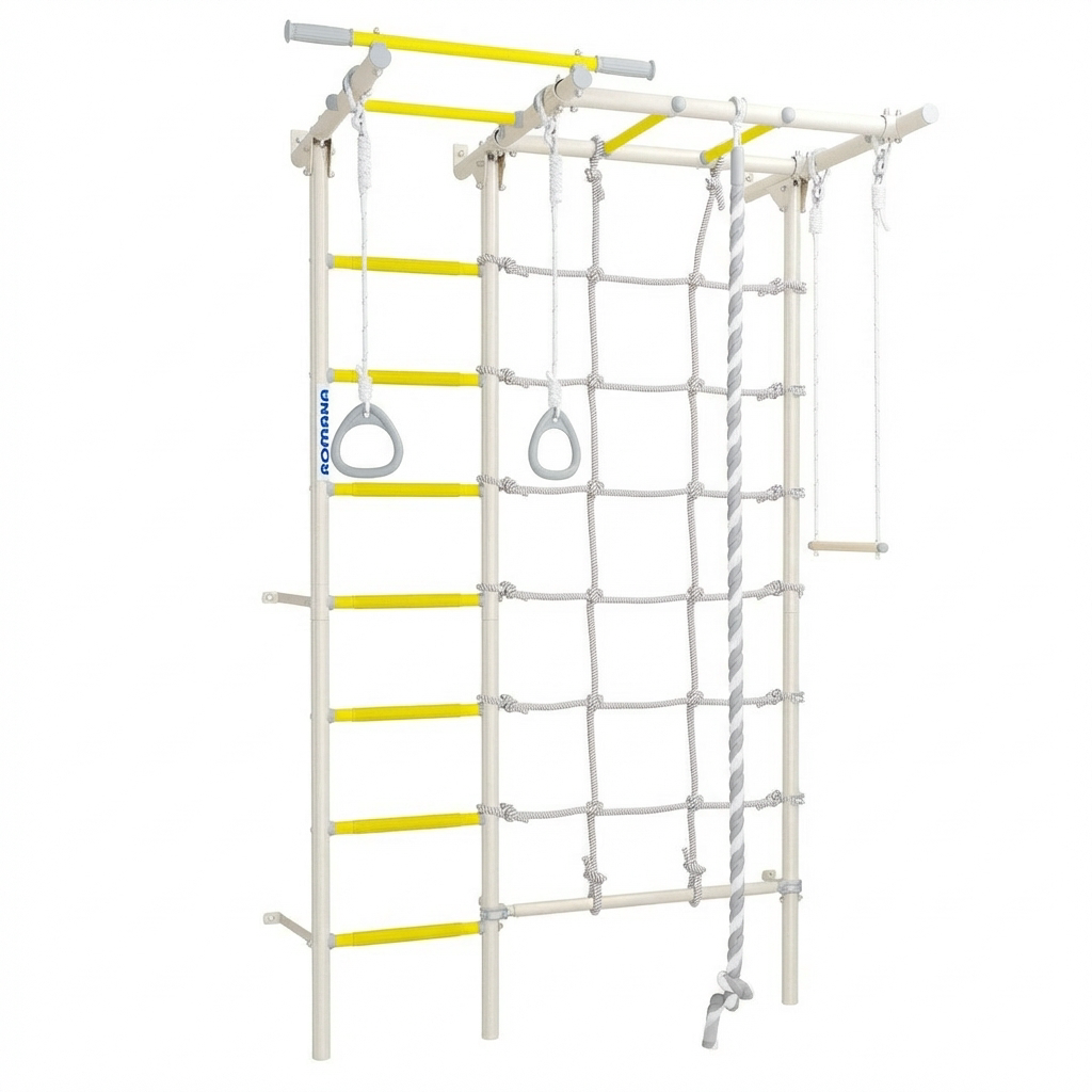 Komplex je vyroben z kvalitních materiálů a má pevnou, odolnou konstrukci, která zaručuje dlouhou životnost a spolehlivost. Je vybaven několika prvky, jako jsou hrazda, lezecká síť, trapéz, lano a kruhy, díky čemuž umožňuje provádět rozmanitá cvičení. Švédská stěna je proto vhodná nejen pro děti, ale i pro dospělé.