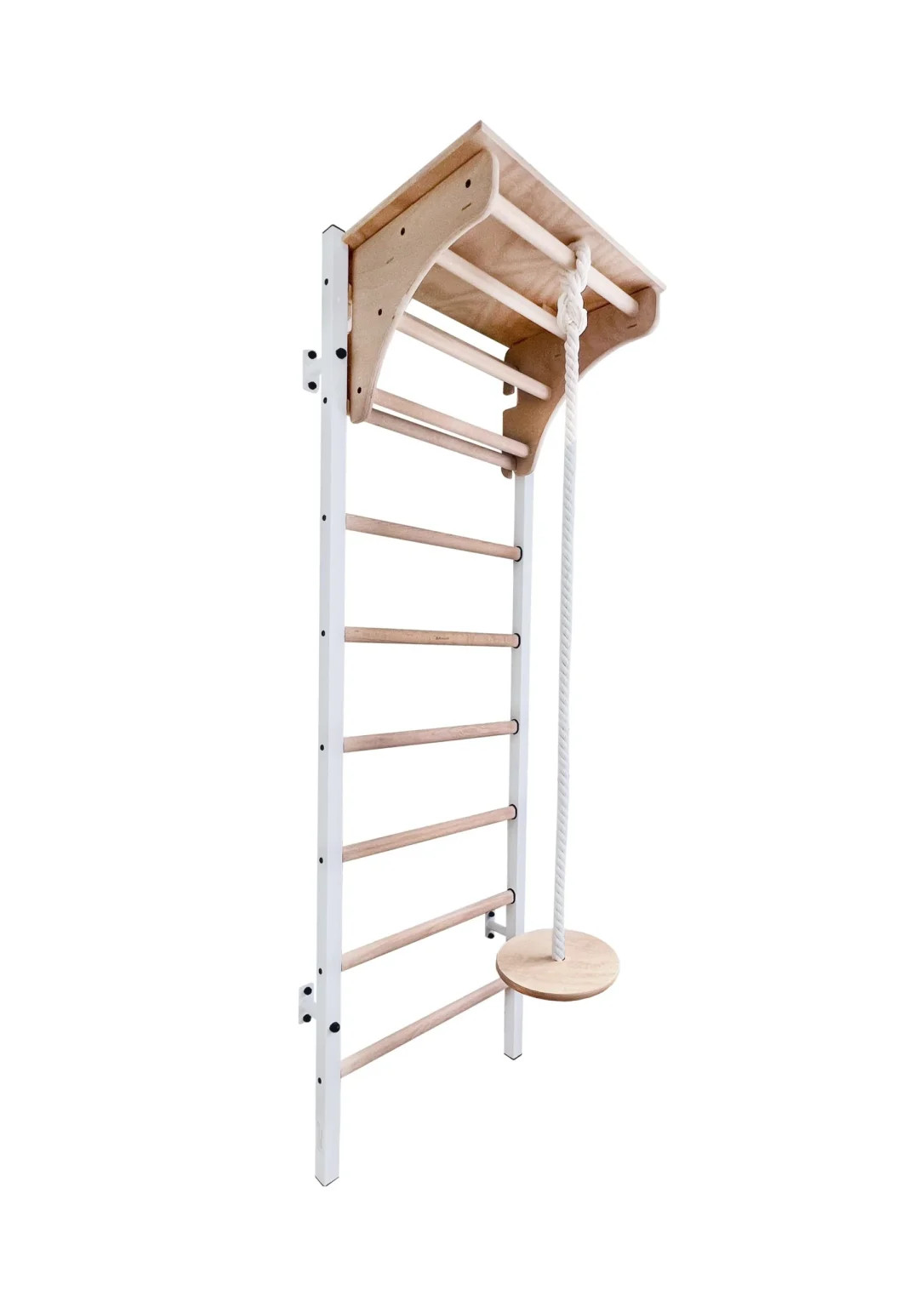 Model žebřiny BnechK 212B + A076 má vertikální profily (50 mm x 40 mm) jsou vyrobeny z vysoce kvalitního kovu, které byly následně lakovány komaxitovou barvou, která je extrémně odolná vůči poškození. Příčky jsou vyrobeny z bukového dřeva - oválného tvaru, povrch příček je naolejován kvalitním olejem, to vše činí žebřiny pohodlným. Maximální hmotnost cvičence je 120 kg. Její instalace je velmi jednoduchá a její design byl navržen tak, aby odpovídal současným trendům v designu interiéru bez narušení celkového interiéru bytu. Dřevěná tmavá hrazda je polohovatelná, takže umožňuje cvičit různé svalové partie. Deska/stolek byl vyroben z bukového dřeva. Nasazuje se na dřevěnou tmavou nebo světlou hrazdu Benchk Pull up bar PB204 a Benchk Pull up bar PB076 a tím vytváří stylový a funkční stůl. Deska/stolek je naolejován olejem nejvyšší kvality. Díky výškovému nastavení hrazdy na žebřině, lze i tento stolek upravovat na výšku uživatele. Využívat ho může opravdu každý, ať dítě nebo doselý. Všechny prvky jsou kvalitně vyrobeny, nemají ostré hrany ani vyčnívající části. Použité při výrobě jsou přírodní materiály, které nezpůsobují alergické reakce. Neodolatelný celek tvoří žebřína s příslušenstvím jako dřevěná polohovatelná hrazda a dětské příslušenství. Gymnastické doplňky jsou pobídkou k přijímání nových výzev a fyzické aktivity. Sada příslušenství obsahuje: pár gymnastických kruhů, horolezecké lano s dřevěnou houpačkou. Doplňky mohou používat osoby s hmotností do 80 kg. Gymnastické kruhy jsou vyrobeny z překližky z bukového dřeva a jsou zavěšeny na černých pruzích. Pásy jsou vybaveny přezkou, která umožňuje rychlé nastavení jejich délky, jakož i snadnou demontáž. Vedle přezky je suchý zip, ve kterém můžete převinout nadbytečný pás. Lano vyrobené ze 100% přírodní bavlny je ručně svázáno v horní části žebříku a připevněno na spodní části, čímž se eliminuje použití kovu nebo plastu. Lano lze použít k lezení nebo pro houpačku. Výrobek splňuje bezpečnostní požadavky obsažené v PN-EN 12346: 2001, PN-EN 913: 2019-03