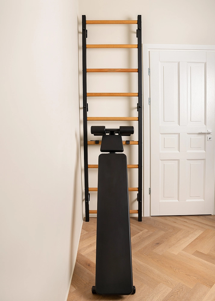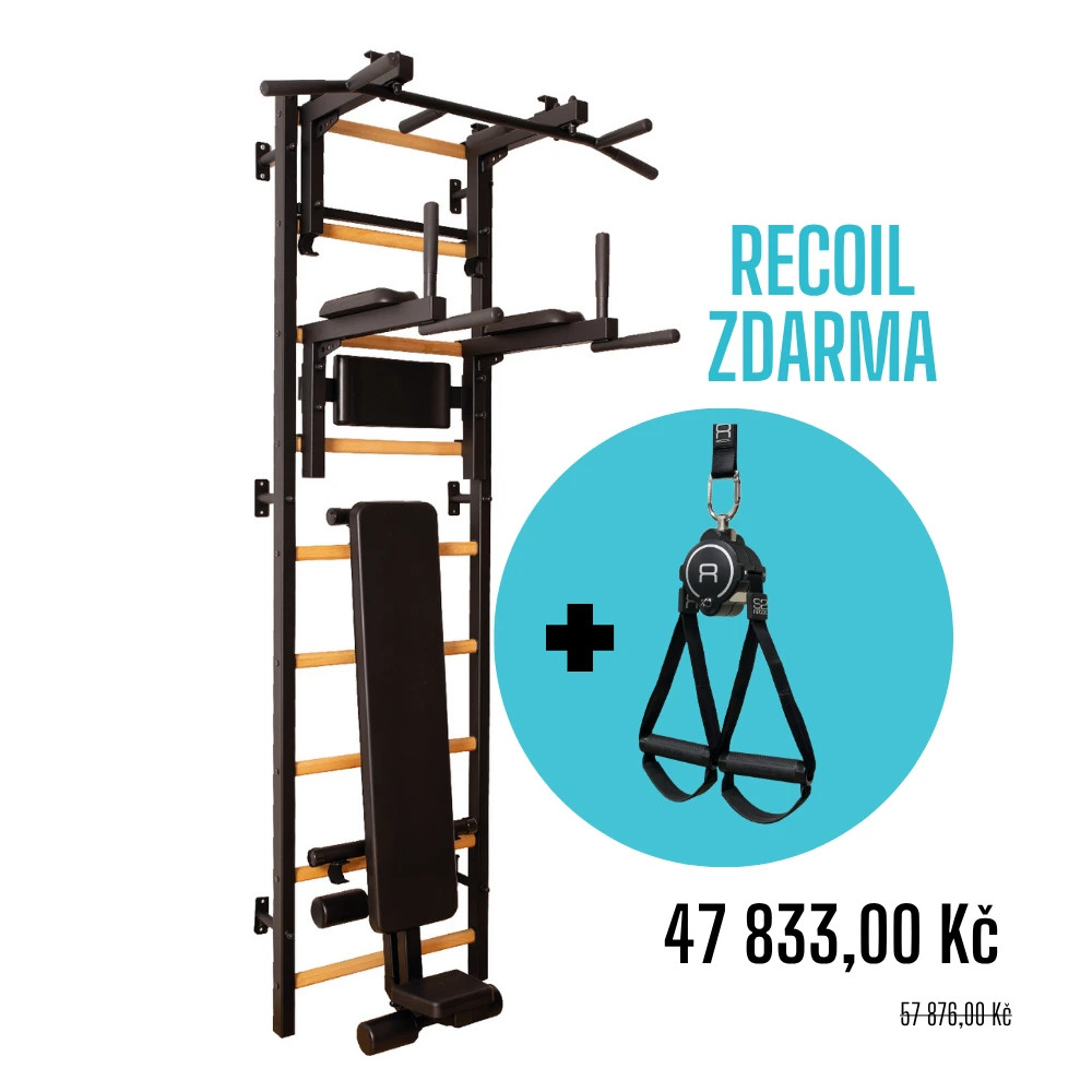 - Sada obsahuje: žebřinu (gymnastický žebřík), nastavitelnou ocelovou hrazdu se 6 úchopy (lze použít i jako stojan na činku), bradla s opěrkou zad, tréninkovou lavici