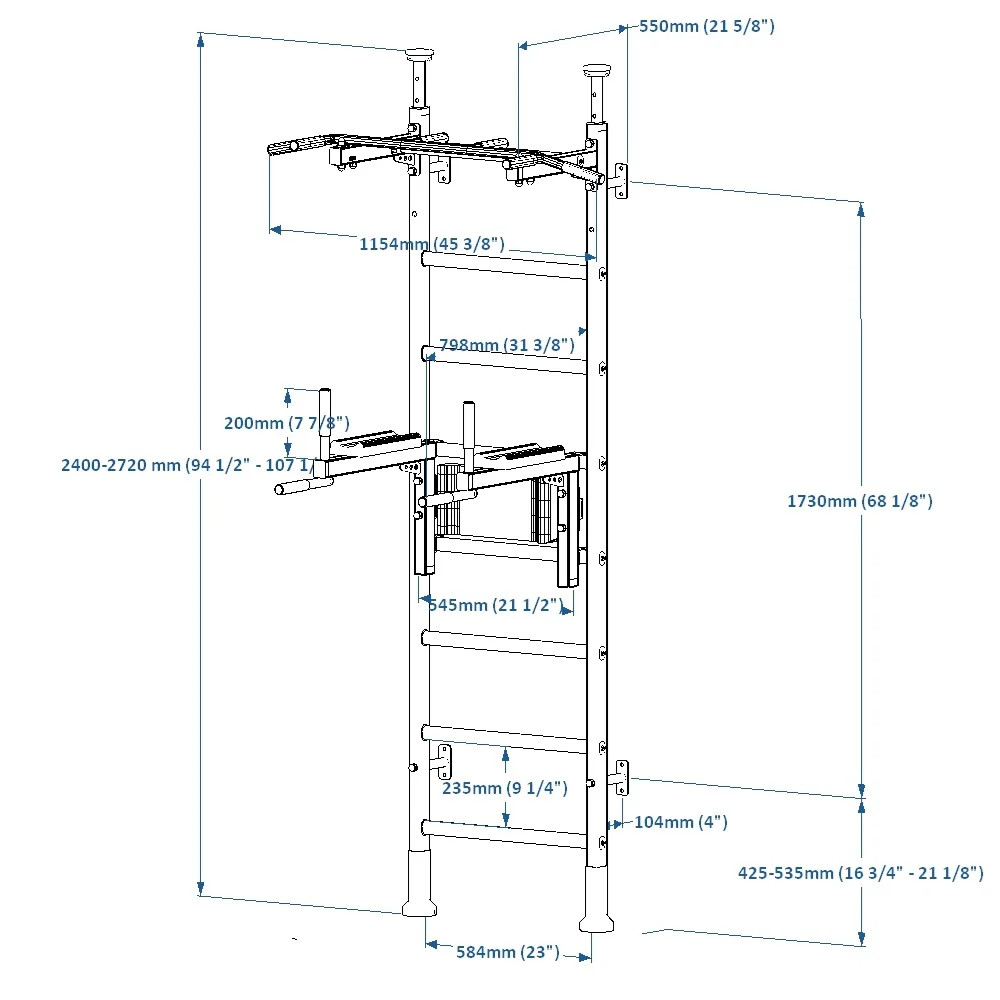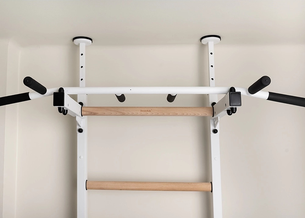 Multifunkční model žebřinyBenchK 522W+A204 je vyroben z kovových profilů (50 mm x 40 mm) a dřevěných bukových příček. Příčky jsou olejovány speciálním olejem, který je odolný vůči nečistotám a oděru. Rovnoměrné svislé boční profily byly natřeny práškovou barvou. Žebřina byla navržena tak, aby plnila nejen funkčnost, ale aby byla i nezbytným doplňkem každé místnosti. Výhodou žebřiny je také to, že prakticky nezabírá prostor. Je třeba poznamenat, že žebřína je velmi odolná a přizpůsobená těžkým břemenům. Maximální hmotnost cvičící osoby je 150 kg. BenchK Dip Bar DB1B / Bradla s opěrkou na záda mají 4 háčky o tloušťce 4 mm, háčky jsou vybaveny plstěnou podložkou, aby se zabránilo poškrábání dřevěných příček žebřiny. Odnímatelná struktura bradel vám umožňuje snadno měnit jejich výšku. BenchK Dip Bar DB1B / Bradla zahrnují odolné a snadno ošetřitelné loketní opěrky vyrobené z integrované polyuretanové pěny a čtyři protiskluzová madla. Gymnastické doplňky budou pobídkou k přijímání nových výzev a fyzické aktivity. Výrobek splňuje bezpečnostní požadavky obsažené v PN-EN 12346: 2001, PN-EN 913: 2019-03.