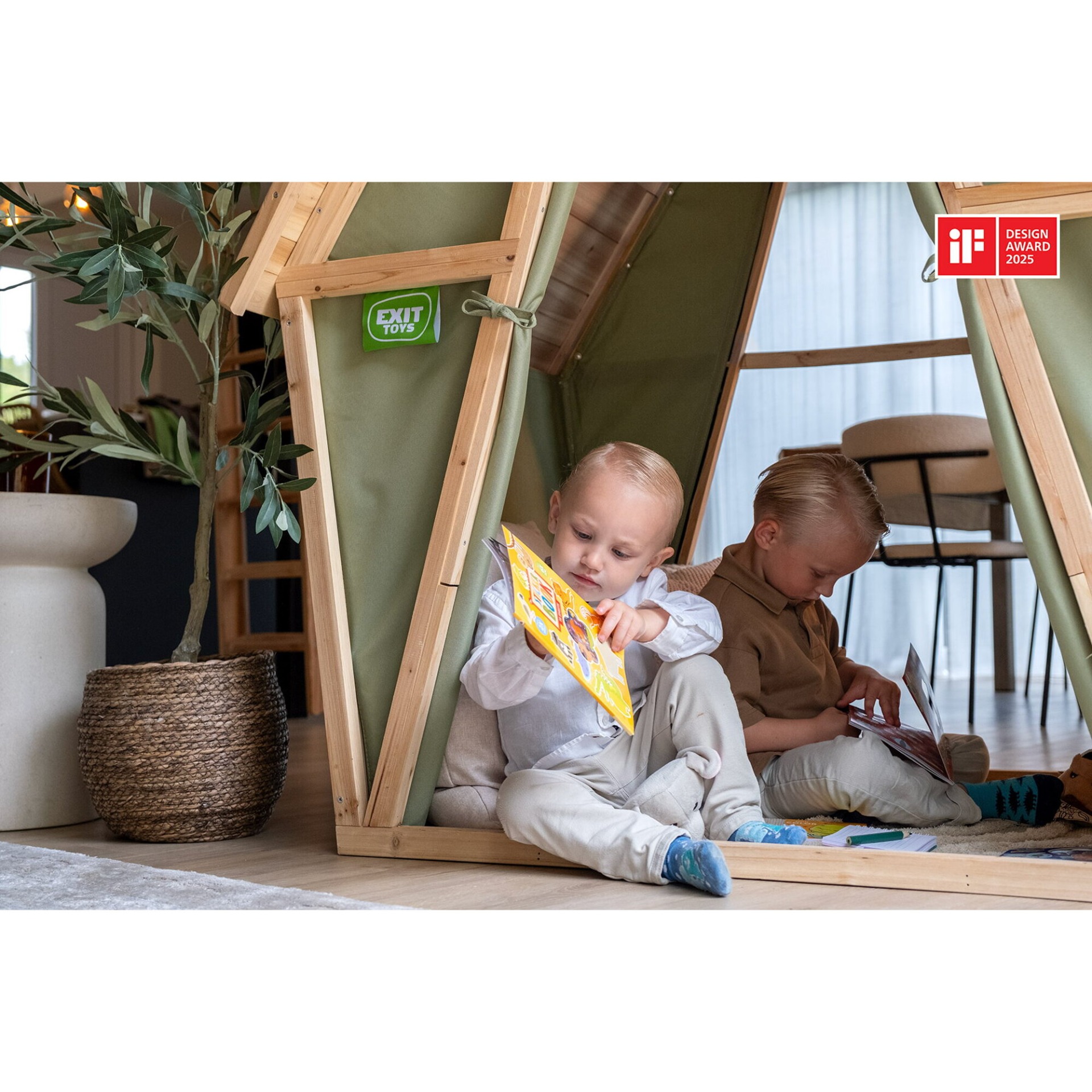 EXIT Yuki 100 je kouzelný domeček pro děti, který v sobě spojuje pohodlí a dobrodružství. Pevný dřevěný rám poskytuje stabilitu klasického domečku, zatímco odolná zelená plachta vytváří příjemnou, stanovou atmosféru. Ať už si vaše dítě chce číst knížku v "kempu" nebo zažít dobrodružství v "safari chatce", s Yuki má nekonečné možnosti. Díky špičaté střeše a hravému designu v přírodním stylu se stane skvělým doplňkem každé zahrady – must-have pro každou rodinu!